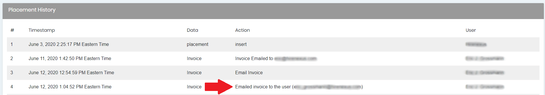 The Placement Log will show that the invoice has been emailed to the user, as pointed out in the figure below.