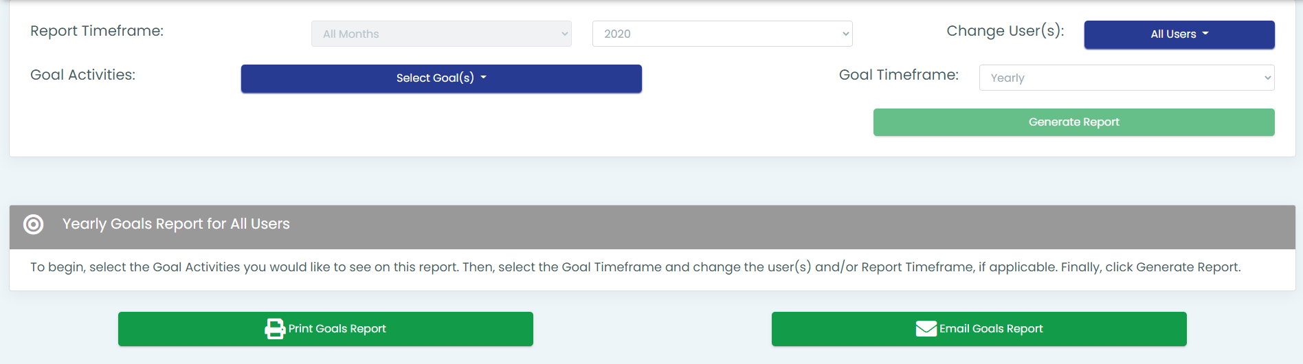 The Goals Report is a fluid, dynamic report that gives users and admins the ability to review goal progress on a more granular level than just annual goal progress. The report requires the user to select options before being generated and there is text in the report body that explains what needs to be done.