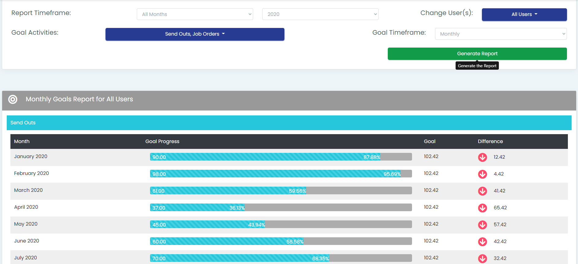 First, select the goal(s) you would like to display on the report. You can select all of them but it is recommended to generate this report in a way that makes sense. For example, interviews and job orders are typically looked at on a weekly basis but placements are more of a monthly or quarterly goal. That said, select the goal(s) you would like to review and then pick the Goal Timeframe you would like. The default is Yearly.