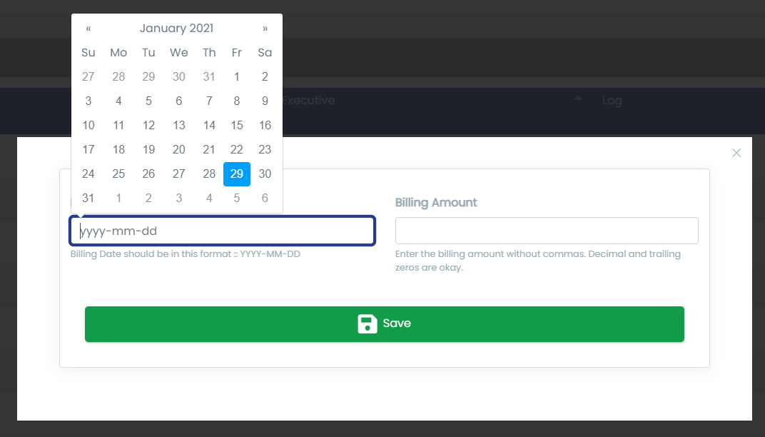 The Add Billing function opens in a modal as shown below. The Billing Date defaults to the current date, January 29, 2021 in this example. Simply select the pertinent date and then enter the billing amount in the Billing Amount field. This amount should be the entire amount regardless of splits--HA will automatically split it out for you. When finished, click Save to save the records to the contract placement.