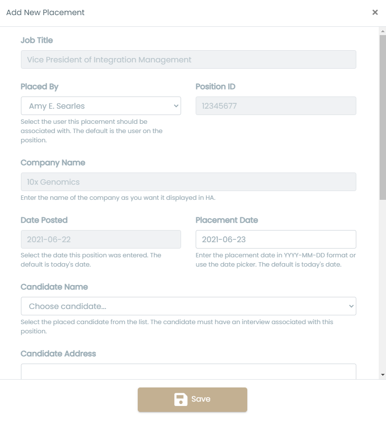 | As you can see in the figure to the right, when the Add New Placement modal opens, several of the fields are already filled out for you and some cannot be changed such as the Job Title, Position ID, Company Name and Date Posted. Placed By defaults to the user associated with the position but this can be changed when adding a placement. Placement Date is set to the current date by default but this can also be changed. Then, select the candidate from the list of candidates in the Candidate Name dropdown. Then fill out the candidate's address and contact information. | ![]() |
