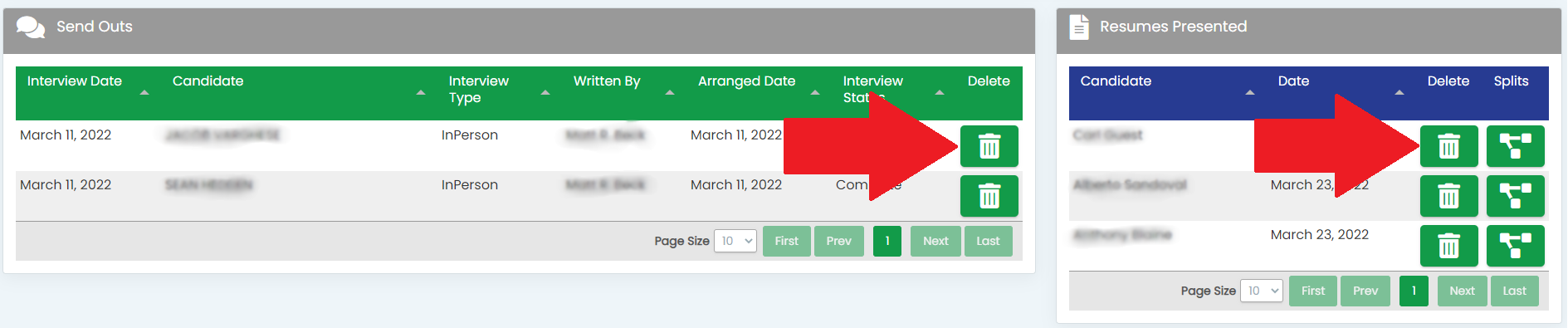 To delete an interview or resume presented on a particular position, open the position details page by clicking on the job title. Scroll down toward the bottom of the page and you will see the Interviews and Resumes sections, as shown in the figure below. Each item listed will have a trash can icon, as pointed out in the figure. This is the Delete button.