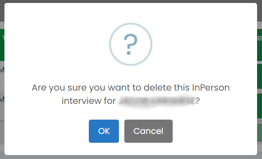 When you click the Delete button, HA will prompt you to make sure you want to delete that particular interview, as shown in the figure to the right. Clicking Cancel will return you to the position details page. If you click OK, the interview will be deleted and you'll receive a prompt when it's completed. | ![]() |